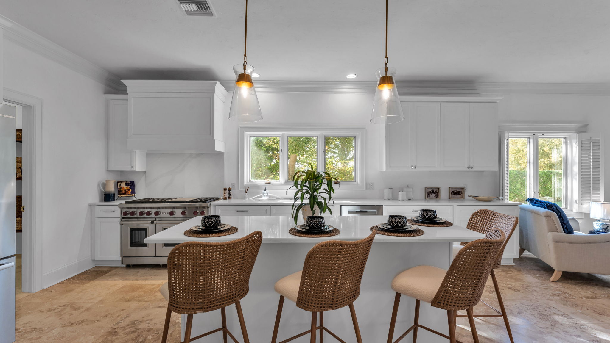 Every element of the renovation was approached with care and craftsmanship. The kitchen has been outfitted with top-of-the-line appliances, custom cabinetry, and luxury materials. The primary suite has been transformed into a spacious retreat with a spa-like bath and ample closet space. Each guest suite features tasteful ensuite bathrooms and refined finishes throughout.